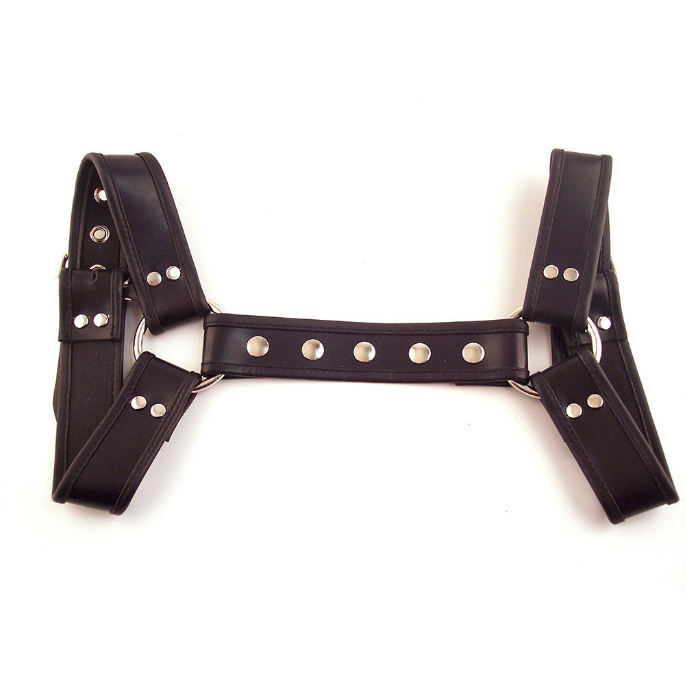 Arnés de cuero tipo halter con correas de cuero y aros. La parte delantera es ajustable con correas con hebillas. Se remata con tachuelas planas en la espalda. Disponible en una gama de ribetes de colores y diferentes tallas (S-XL). Talla pequeña: 89-94 cm. Talla mediana: 96-102 cm. Talla grande: 104-109 cm. Talla extra grande: 112-117 cm.