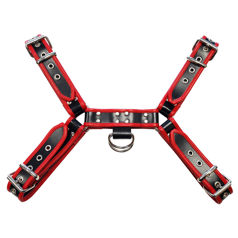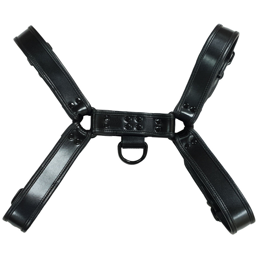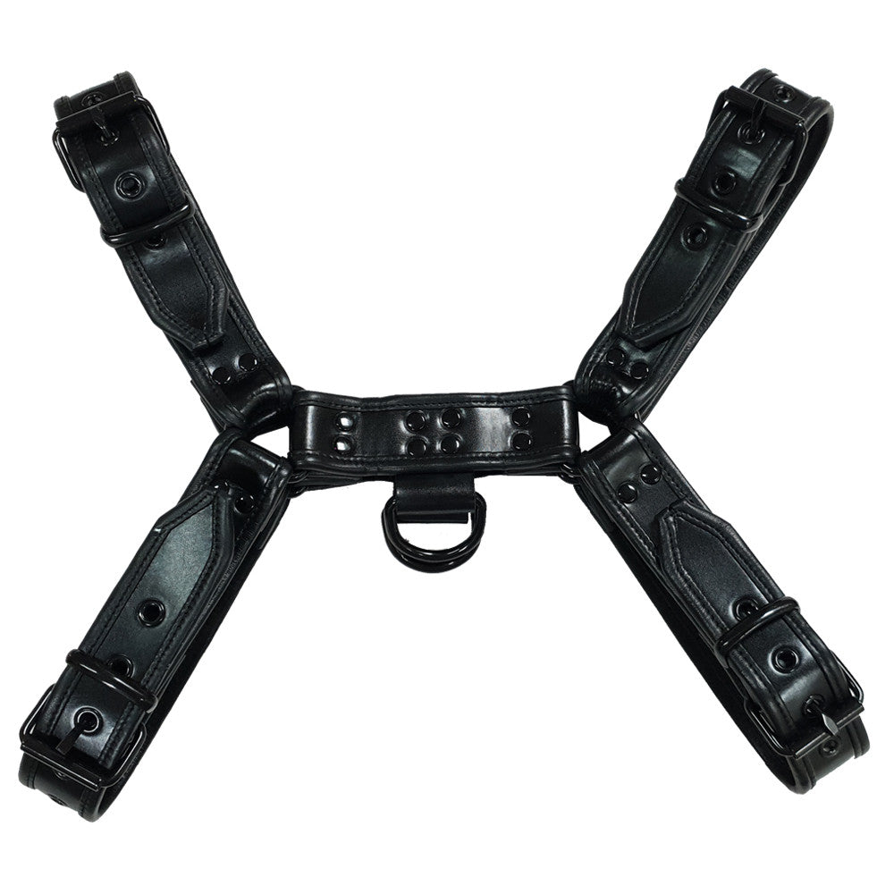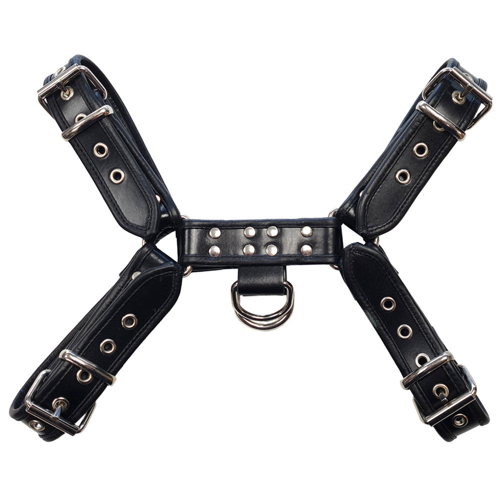 Arnés de cuero bondage O.T H-Front con accesorios negros. Luce tu pecho y hombros definidos con este arnés de cuero. Disponible en diferentes tallas y ajustable mediante correas. Expresa tu sexualidad, presume tu cuerpo y llama la atención.